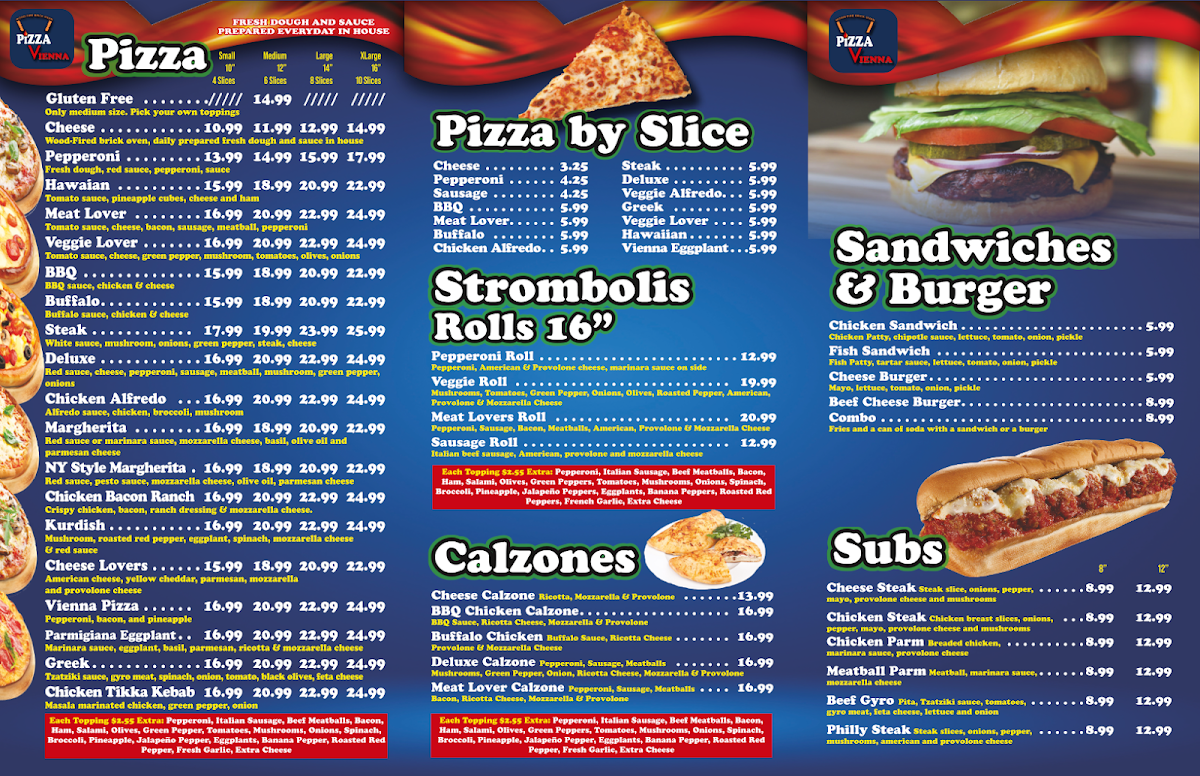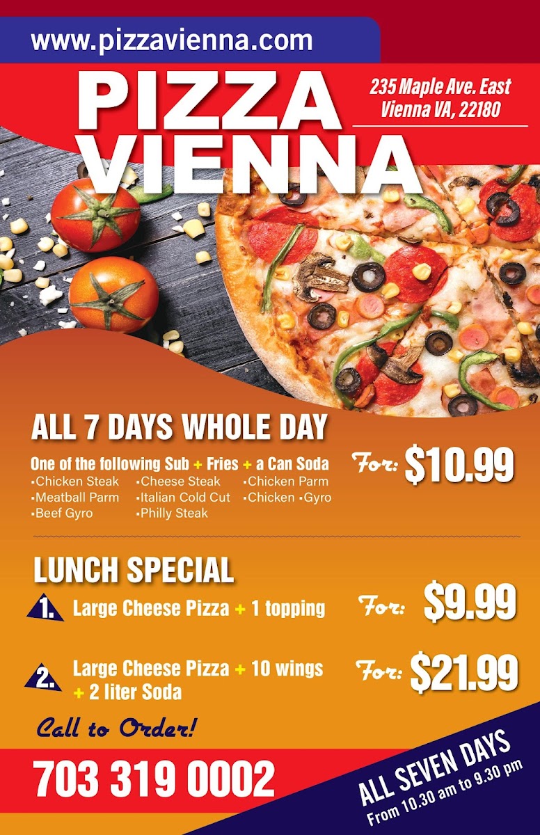 Welcome to Pizza Vienna, a delightful culinary gem known for its delicious, fresh offerings and warm ambiance. Located conveniently for quick stops or family meals, this restaurant specializes in an array of pizzas, subs, and Italian dishes that are both flavorful and satisfying. Diners rave about the wood-fired crust, fresh ingredients, and friendly service that create an inviting atmosphere. Whether you're enjoying a cheesy slice or a flavorful chicken parm sub, Pizza Vienna delivers quality and taste at reasonable prices. Join the growing number of satisfied customers who have discovered this foodie haven—every visit promises something new and delightful!
